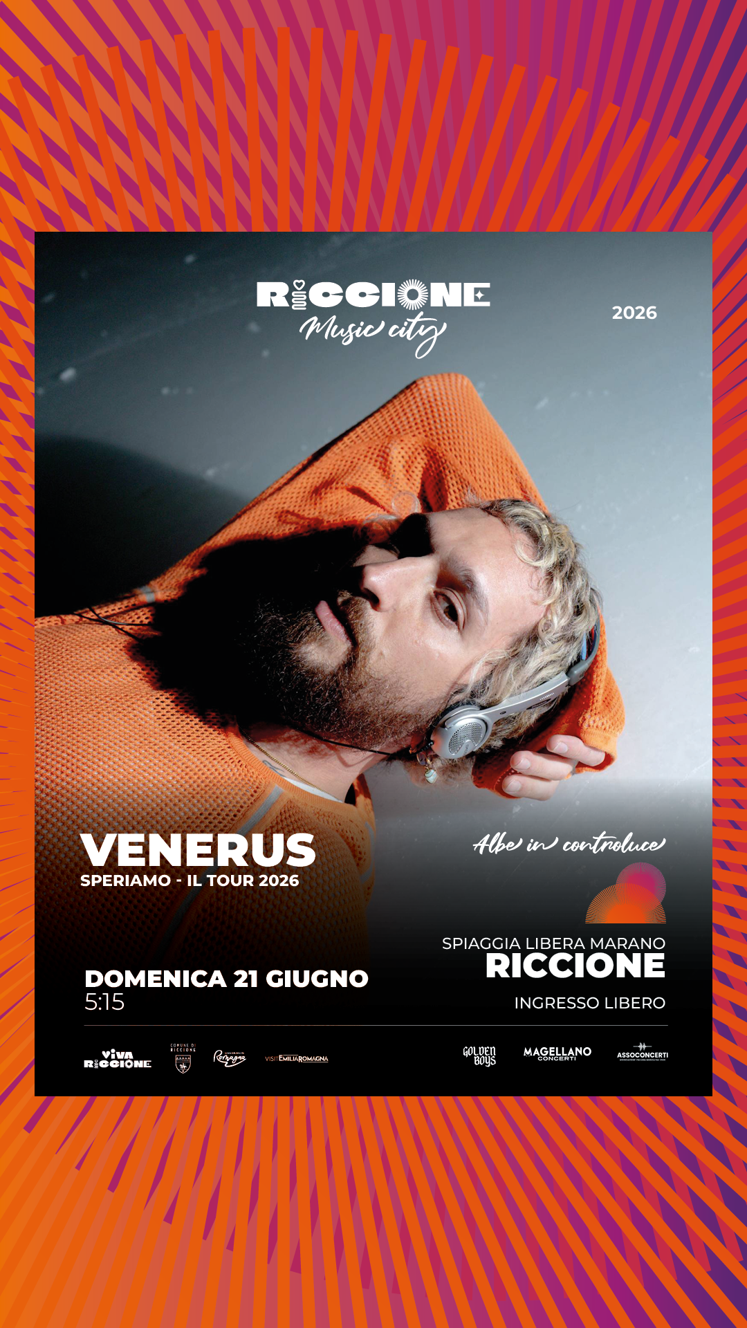 Ad aprire la rassegna, nel giorno simbolico del solstizio d’estate e nel cuore del weekend de La Notte Rosa, sarà Venerus, una delle voci più riconoscibili, intense e innovative del cantautorato contemporaneo italiano. Artista capace di attraversare generi e linguaggi, Venerus ha costruito negli anni un percorso unico, in cui scrittura, produzione e ricerca sonora convivono in una dimensione profondamente personale e internazionale. Con Speriamo – Il tour 2026, organizzato e prodotto da Magellano Concerti, porta dal vivo un progetto che nasce come naturale estensione del suo ultimo album: uno spettacolo immersivo in cui le canzoni diventano materia viva, si trasformano, respirano e si intrecciano con racconti, visioni ed emozioni. Sul palco ogni brano si apre a nuove possibilità, restituendo le molteplici “ere” creative che ne hanno segnato la nascita. Il concerto si configura come un vero e proprio rituale collettivo, in cui il pubblico è invitato a lasciarsi attraversare da quel senso di fiducioso abbandono racchiuso in quello “speriamo”, oggi quasi un mantra quotidiano. Un’apertura che trova nelle Albe in controluce la sua dimensione ideale, un tempo sospeso, fragile e potentissimo, dove la musica incontra il mare e l’ascolto si fa esperienza totale.
