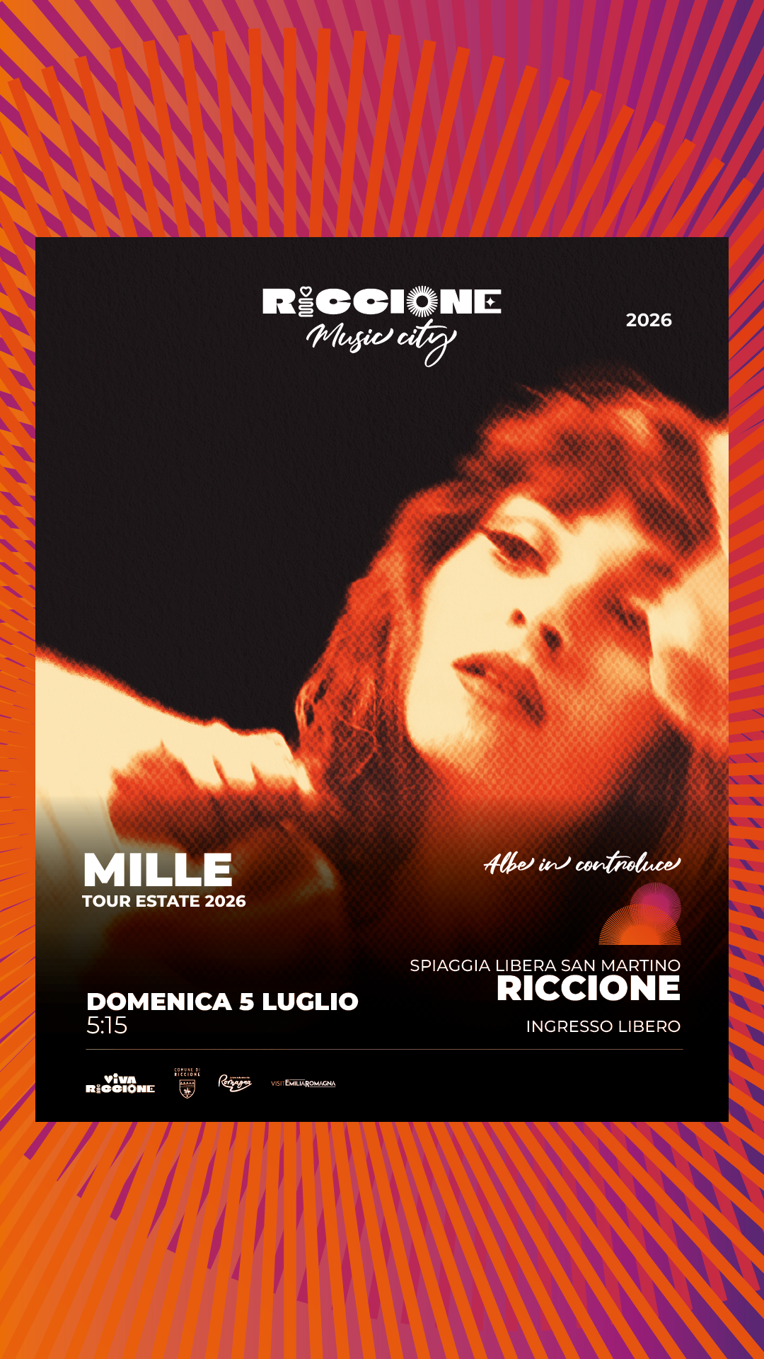 Nella cornice del mare, alle prime luci del mattino, tutto cambia: i suoni, i colori, il ritmo stesso del paesaggio costruiscono un’atmosfera unica, sospesa. È qui che le Albe in controluce trovano la loro dimensione più autentica, tornando ogni estate come uno degli appuntamenti più attesi, capace di richiamare residenti e turisti e diventato nel tempo un segno distintivo dell’identità di Riccione. Dal 21 giugno al 9 agosto, la rassegna rappresenta il cuore della programmazione estiva: concerti a cielo aperto, in riva all’Adriatico, che trasformano il sorgere del sole in un’esperienza da vivere e condividere. La rassegna è promossa, curata e organizzata dagli assessorati alla Cultura e al Turismo del Comune di Riccione in collaborazione con gli operatori balneari. Tutti gli spettacoli sono a ingresso libero.