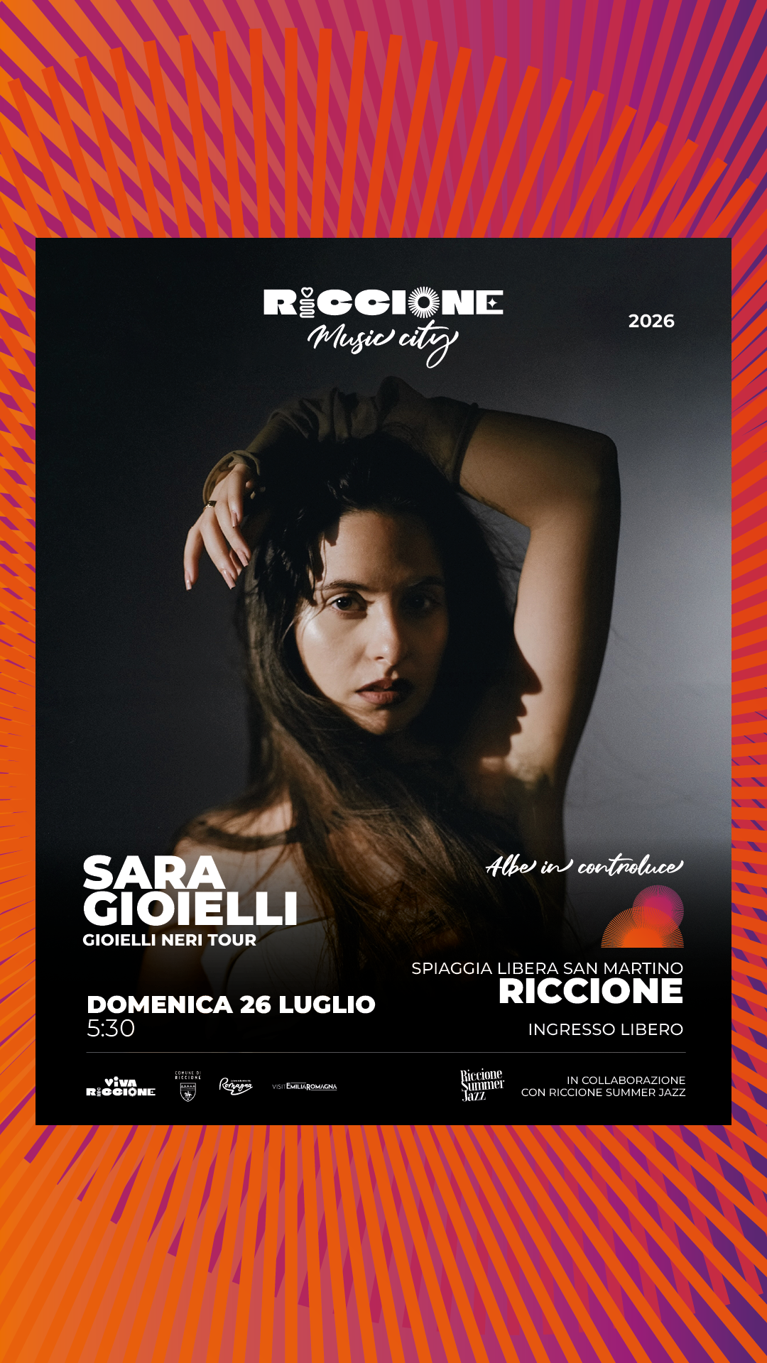 La quinta alba, presentata in collaborazione con Riccione Summer Jazz, accoglie Sara Gioielli, giovane cantautrice e produttrice napoletana. La sua presenza si inserisce in uno dei momenti più significativi della programmazione musicale estiva della città, dialogando con un festival centrale del progetto Riccione City Music e portando alle Albe una sensibilità profondamente legata al linguaggio del jazz e alla sua evoluzione contemporanea. Il suo percorso unisce formazione classica, studi jazz e ricerca elettronica, dando vita a un linguaggio libero e personale, in cui la scrittura si intreccia con la sperimentazione sonora. Cresciuta musicalmente anche all’interno del Teatro San Carlo di Napoli e poi formata nel canto jazz, Sara Gioielli ha sviluppato una voce capace di attraversare generi e contesti, mantenendo sempre una forte identità espressiva. Negli ultimi anni ha affiancato al proprio progetto esperienze di grande rilievo sulla scena musicale contemporanea: ha collaborato come corista con La Niña, protagonista della scorsa edizione di Albe in controluce sulla stessa spiaggia, e ha preso parte al live di Liberato al Circo Massimo, contribuendo a uno degli eventi più iconici della scena recente. Un percorso che testimonia la sua capacità di muoversi tra mondi diversi, mantenendo una coerenza artistica solida e riconoscibile. Il suo album Gioielli Neri rappresenta un punto di arrivo e insieme una nuova apertura, un lavoro in cui convivono radici e sperimentazione, scrittura intima e produzione contemporanea. La sua presenza alle Albe, tappa del tour organizzato da All Things Live, si inserisce così in una significativa continuità, raccogliendo il testimone de La Niña e rafforzando un dialogo tra nuove voci femminili della scena italiana, in un contesto – quello del sorgere del sole – che esalta l’ascolto e la relazione diretta con il pubblico.