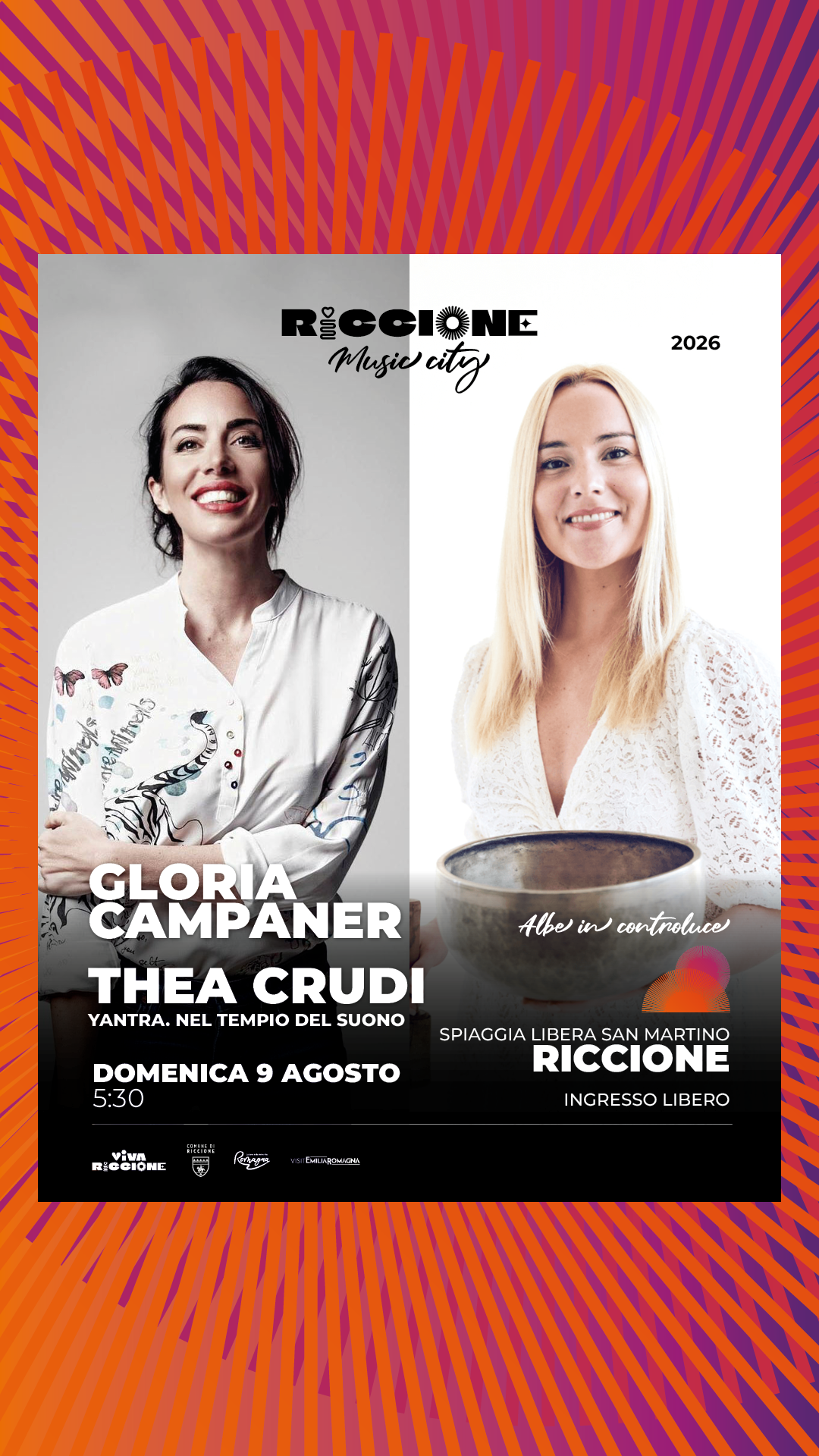 - 9 agosto 2026 – ore 5:30 Gloria Campaner & Thea Crudi – Riccione, Spiaggia libera