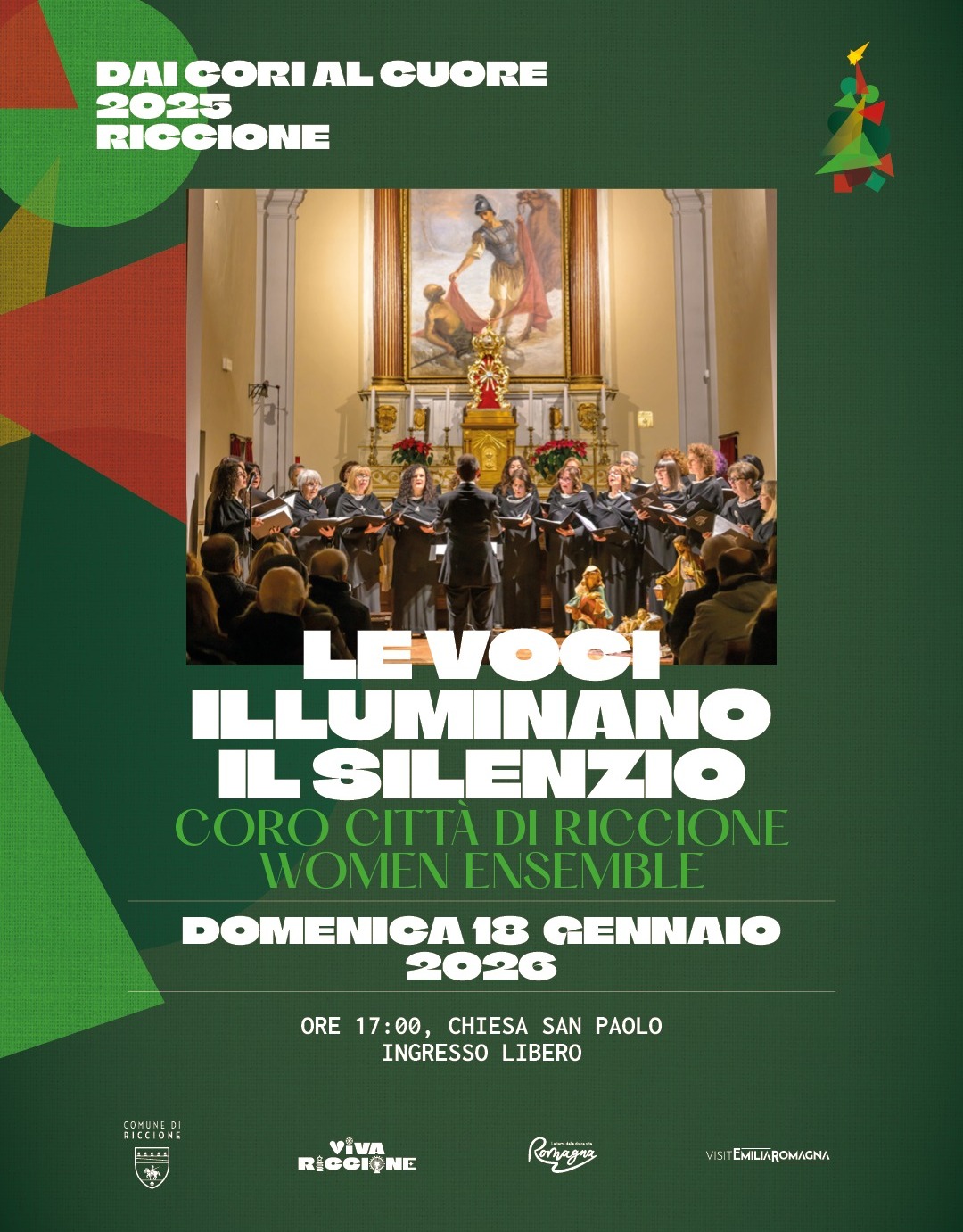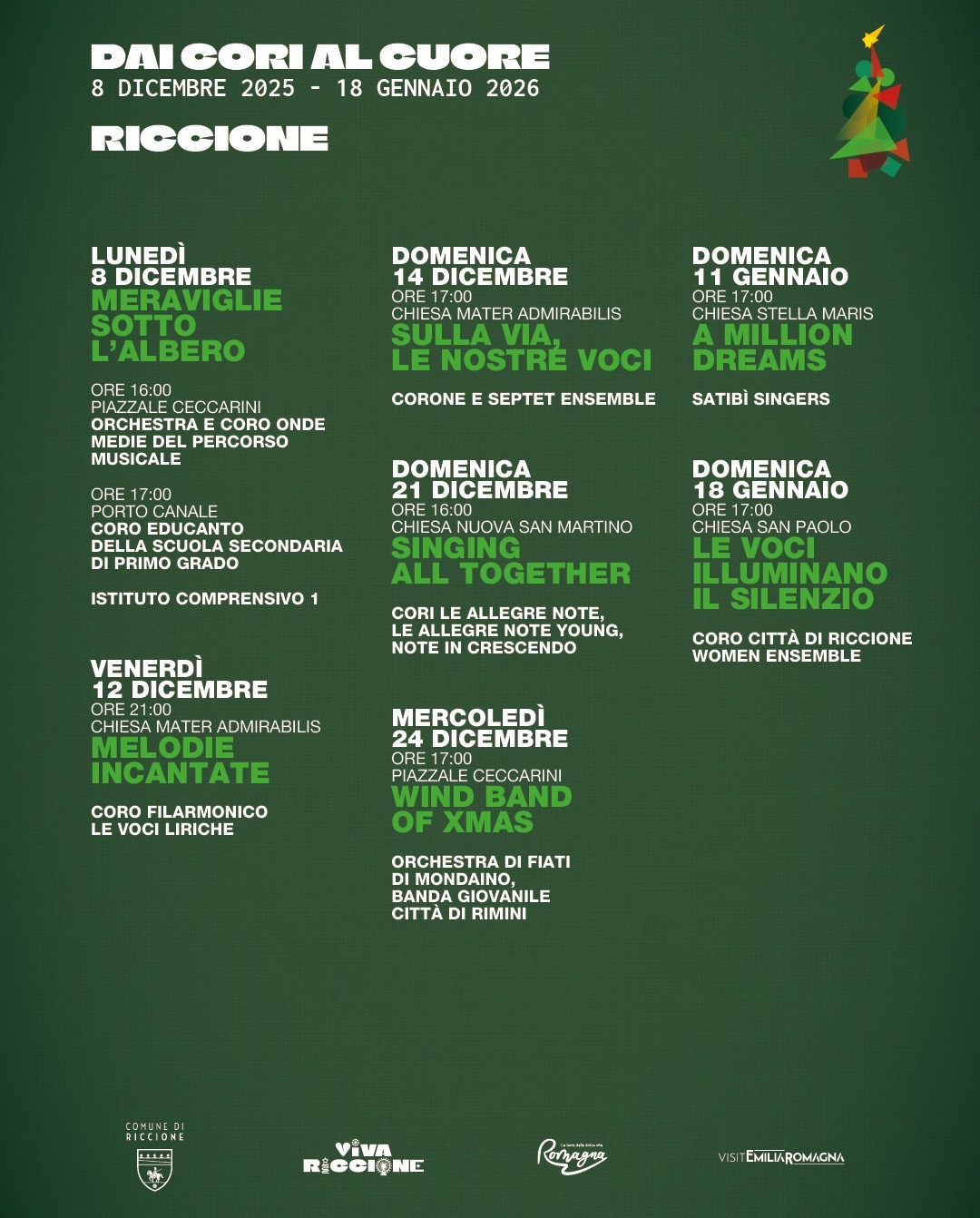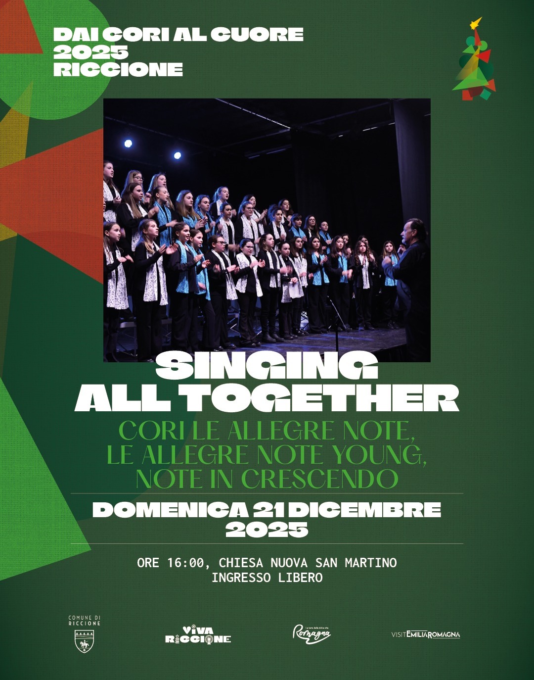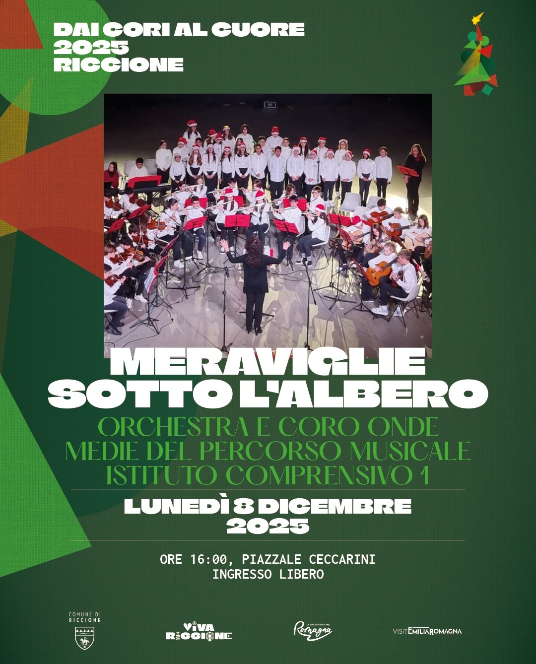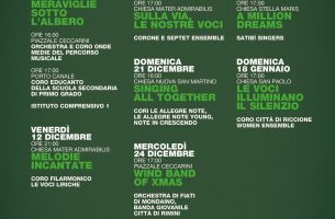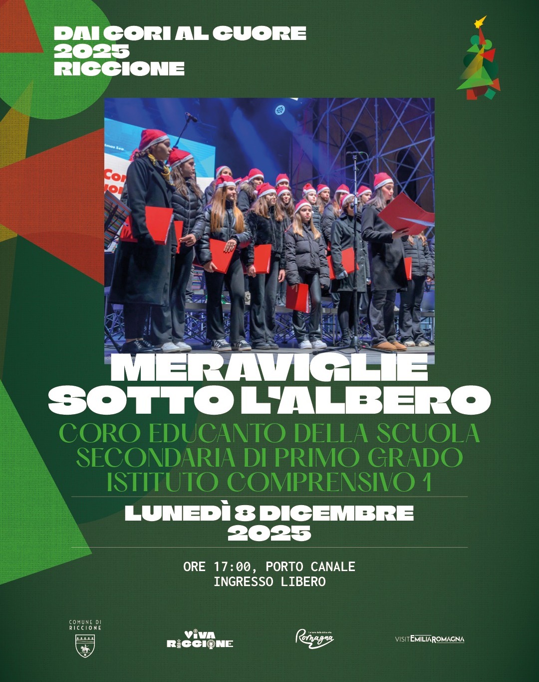 Il pomeriggio si apre con il concerto Meraviglie sotto l’albero della rassegna “Dai cori al cuore”. Alle 16, in piazzale Ceccarini, l’Orchestra e il coro Onde Medie del percorso musicale dell’Istituto Comprensivo 1 Riccione si esibiranno con canti e musiche della tradizione natalizia. Il coro, presente dagli anni ‘80 nella scuola, è curato dalle docenti Elisa Casadei Olivieri, Sabrina Franca, Signe Kull, Patrizia Venturini. Alle 17, il coro Educanto della scuola secondaria di primo grado dell’Istituto Comprensivo 1 Riccione, diretto dalla professoressa Silvia Vico, accompagnerà l’accensione del grande albero sul ponte del porto canale.
