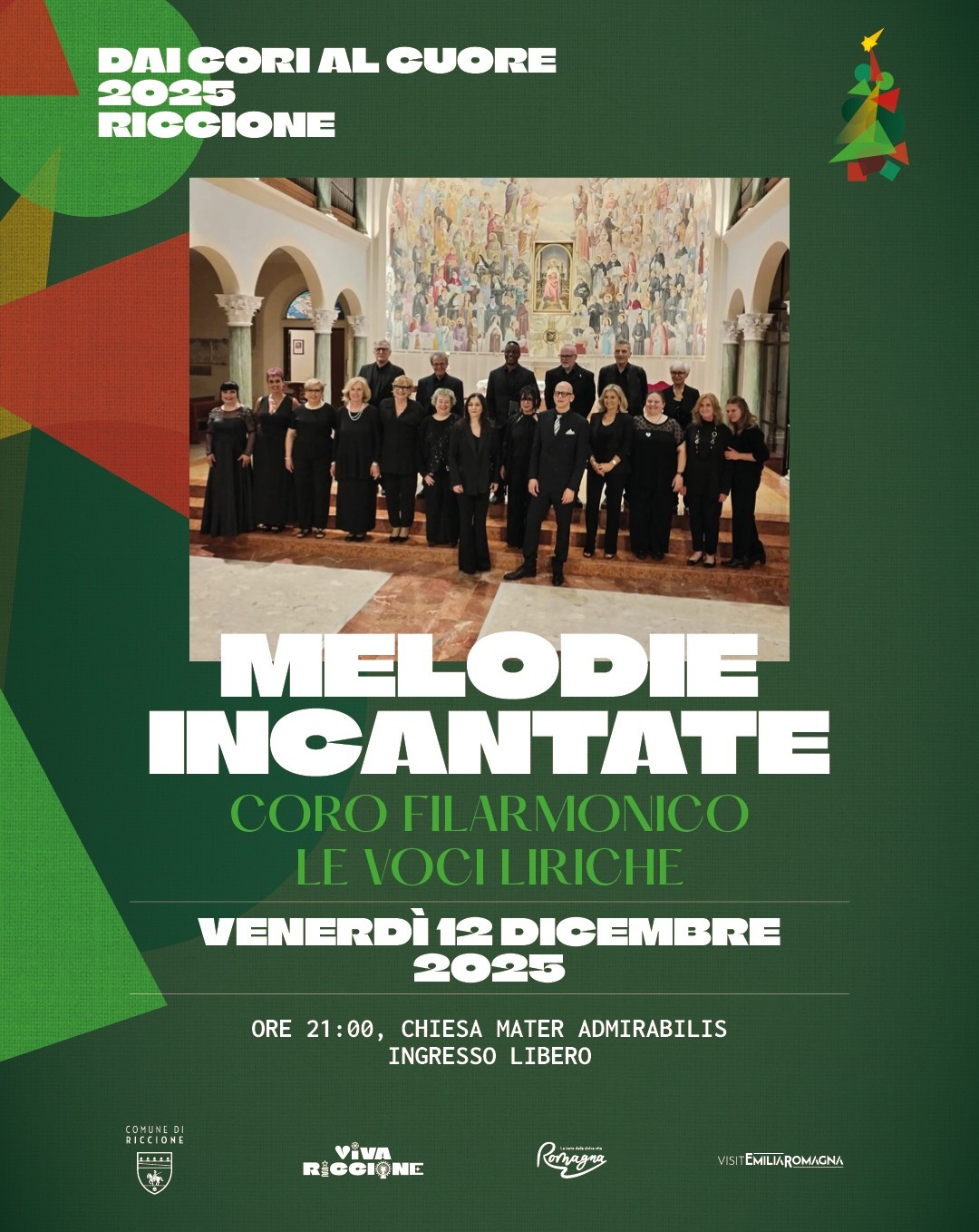 Venerdì 12 dicembre (ore 21) la rassegna  rosegue alla Chiesa Mater Admirabilis con il concerto “Melodie incantate” del Coro Filarmonico Le Voci Liriche. Fondato nel 2015, il coro unisce cantori amatori e professionisti. Sotto la guida del Maestro Silvia Vico e con il sostegno artistico del pianista Maestro Antonio D’Abramo, negli anni, si è distinto per la raffinatezza musicale e per la profondità interpretativa delle proprie esecuzioni, trasformando ogni concerto in un’esperienza viva, capace di toccare l’animo di chi ascolta.