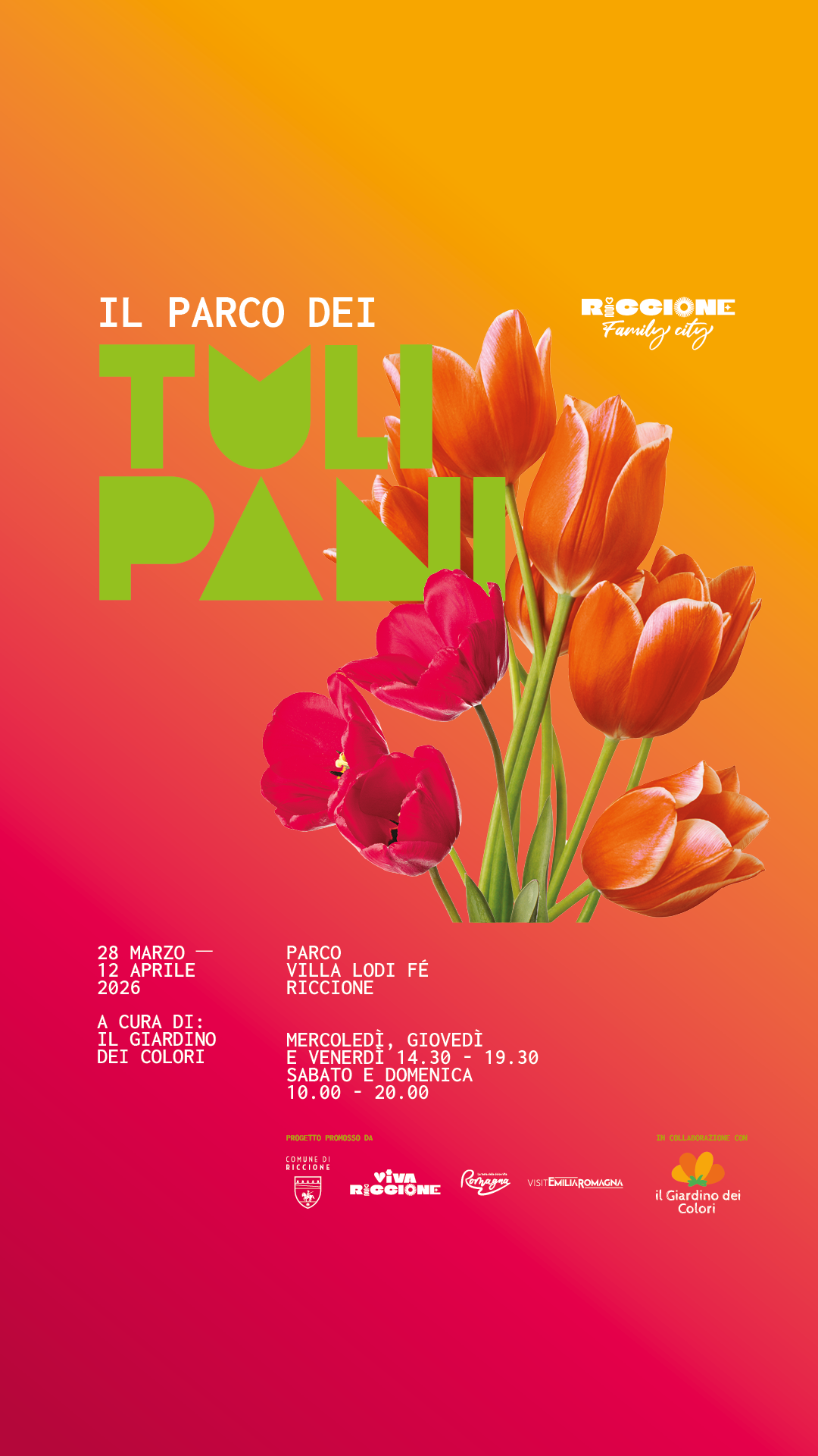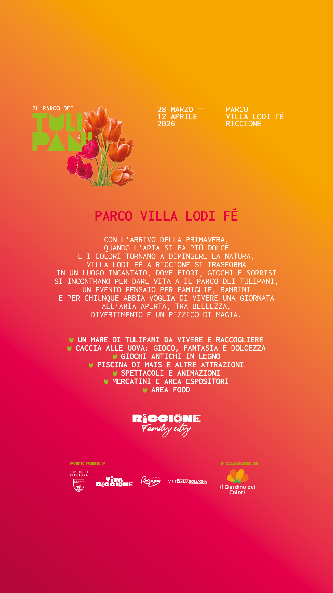 Riccione si prepara ad accogliere la stagione più dolce con un’esplosione di colori e profumi. Con l’arrivo della primavera e delle festività pasquali, il giardino di Villa Lodi Fé si trasforma ne “Il Parco dei tulipani”, un’iniziativa realizzata da Il Giardino dei Colori – già noto per il grande successo riscosso lo scorso Halloween con il “Parco delle zucche” – che porta un suggestivo angolo d’Olanda nel cuore della città. Un evento pensato per cittadini e visitatori di ogni età, dove la bellezza della natura si sposa con la magia delle tradizioni pasquali.