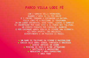 Dal 28 marzo al 12 aprile oltre 50mila tulipani coloreranno il parco della storica villa per celebrare la primavera e la Pasqua in un grande evento per tutti che unisce raccolta fiori, caccia alle uova, giochi antichi e spettacoli itineranti
