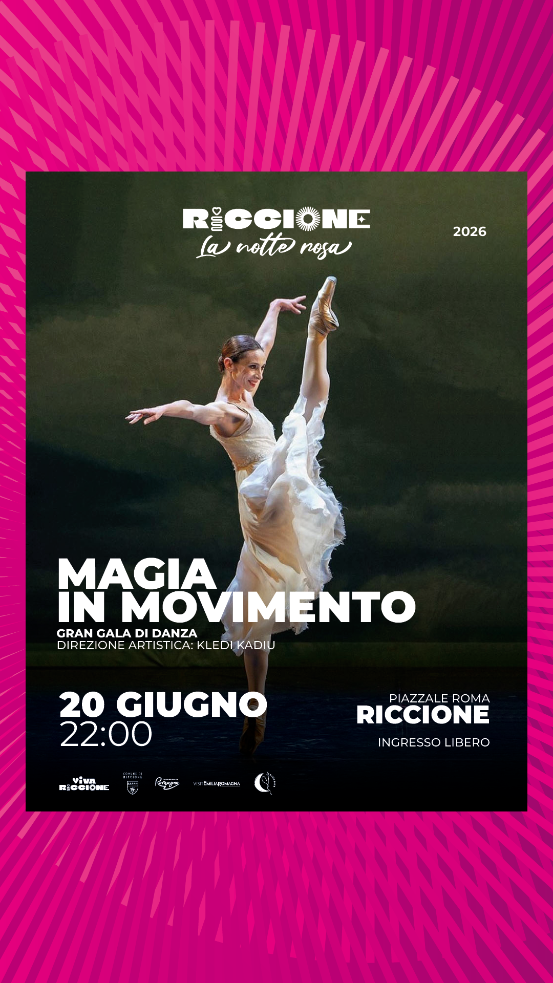 Giovedì 20 giugno ore 22:00, la danza torna a incantare il pubblico di Riccione con Magia in movimento, lo spettacolo che trasforma il palco di piazzale Roma in un suggestivo teatro a cielo aperto dove il linguaggio universale del corpo si intreccia con l’energia della musica e la bellezza dell’arte.