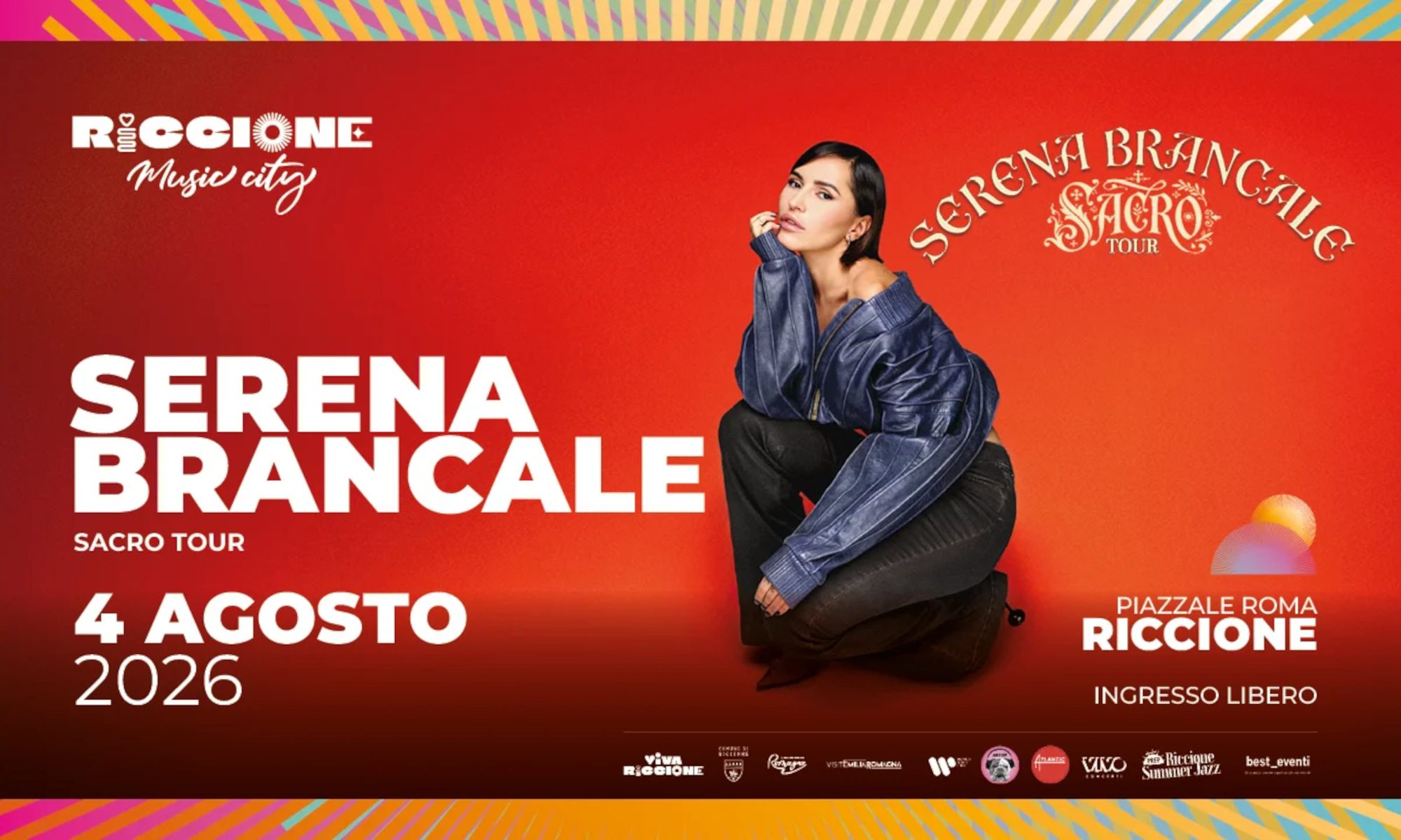Dopo aver emozionato il pubblico con “Qui con me” al Festival di Sanremo, l’artista porterà a Riccione, in un live a ingresso gratuito, una tappa del suo “Sacro tour”. Il live rappresenta uno spettacolo che promette di unire energia e spiritualità, groove e introspezione, radici e sperimentazione, confermando Serena come una delle artiste italiane più apprezzate del momento.