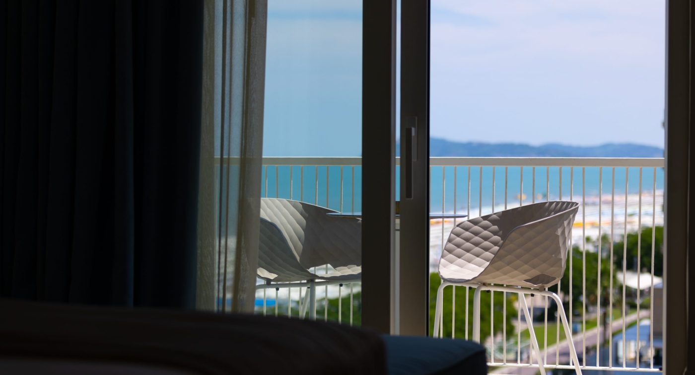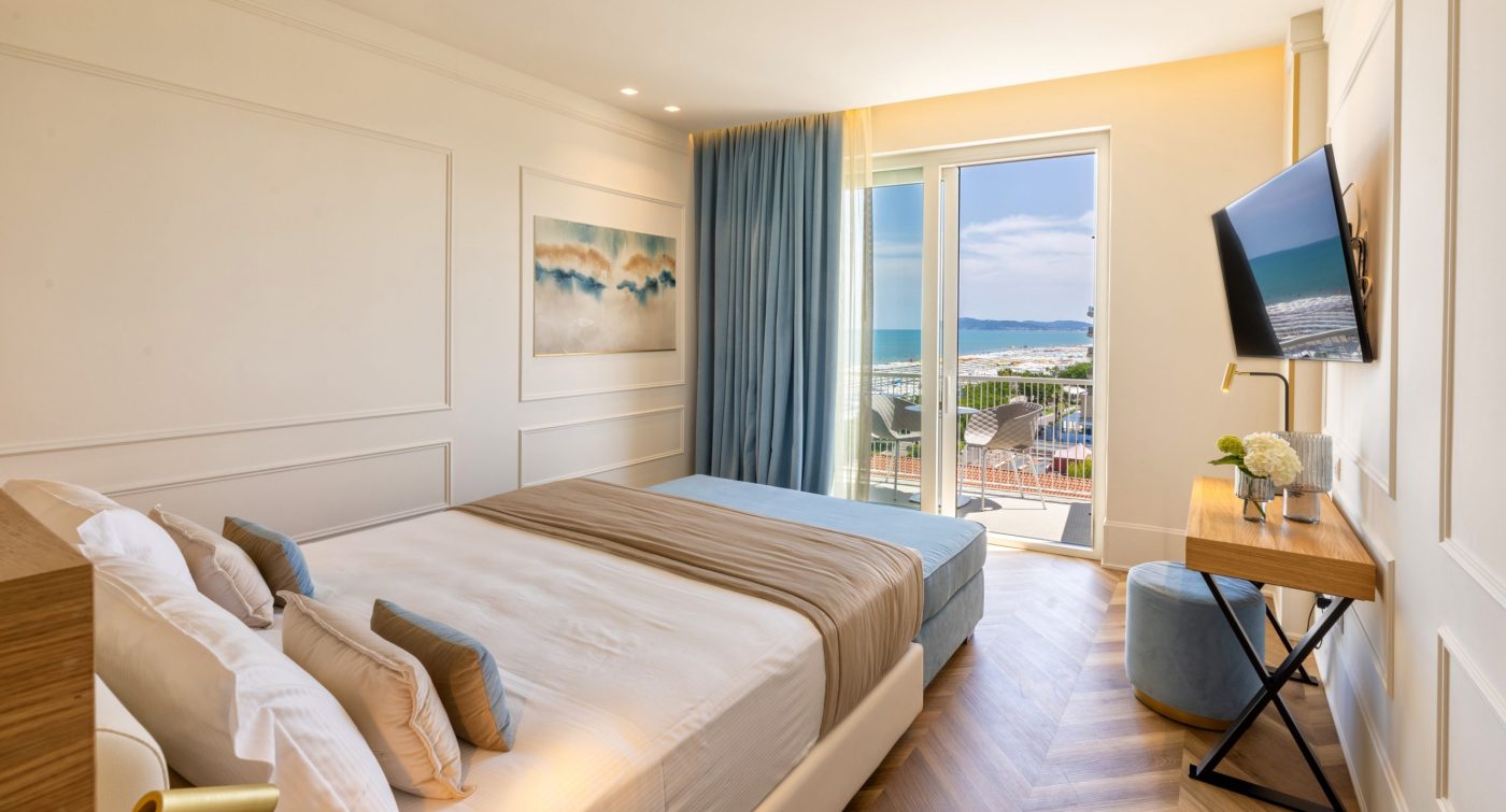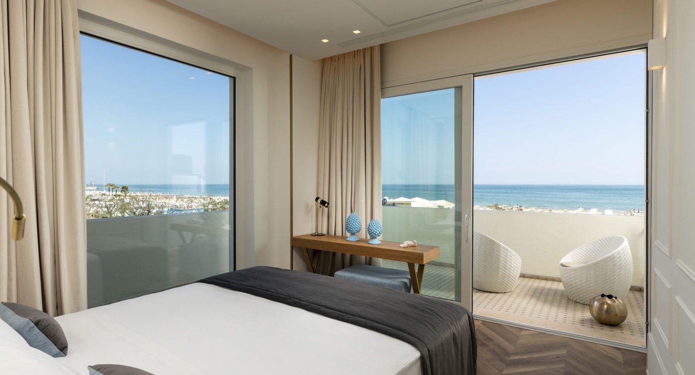 Le nostre camere e suite con vista mare, offrono arredamenti eleganti e comfort esclusivi come Wi-Fi gratuito, Sky TV, minibar, coffee station, luxury courtesy set, climatizzazione autonoma, room service e tanto altro. Dalle accoglienti camere singole alle lussuose Suite, ogni spazio è progettato per assicurare il massimo relax e un’ospitalità a 4 stelle nel cuore pulsante di Riccione. Disponiamo inoltre di camere progettate per garantire l’accesso ed il comfort a persone con disabilità