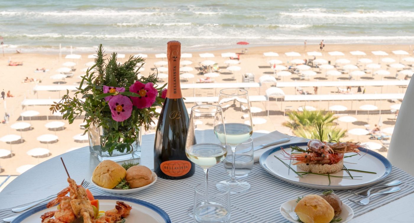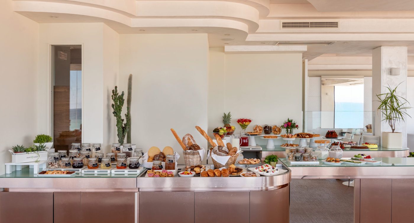 Sky Restaurant panoramico al 5° piano con vista mozzafiato, la ricca cucina unisce piatti della tradizione romagnola a specialità della cucina italiana, pesce, carne, ma anche piatti vegetariani e vegani.