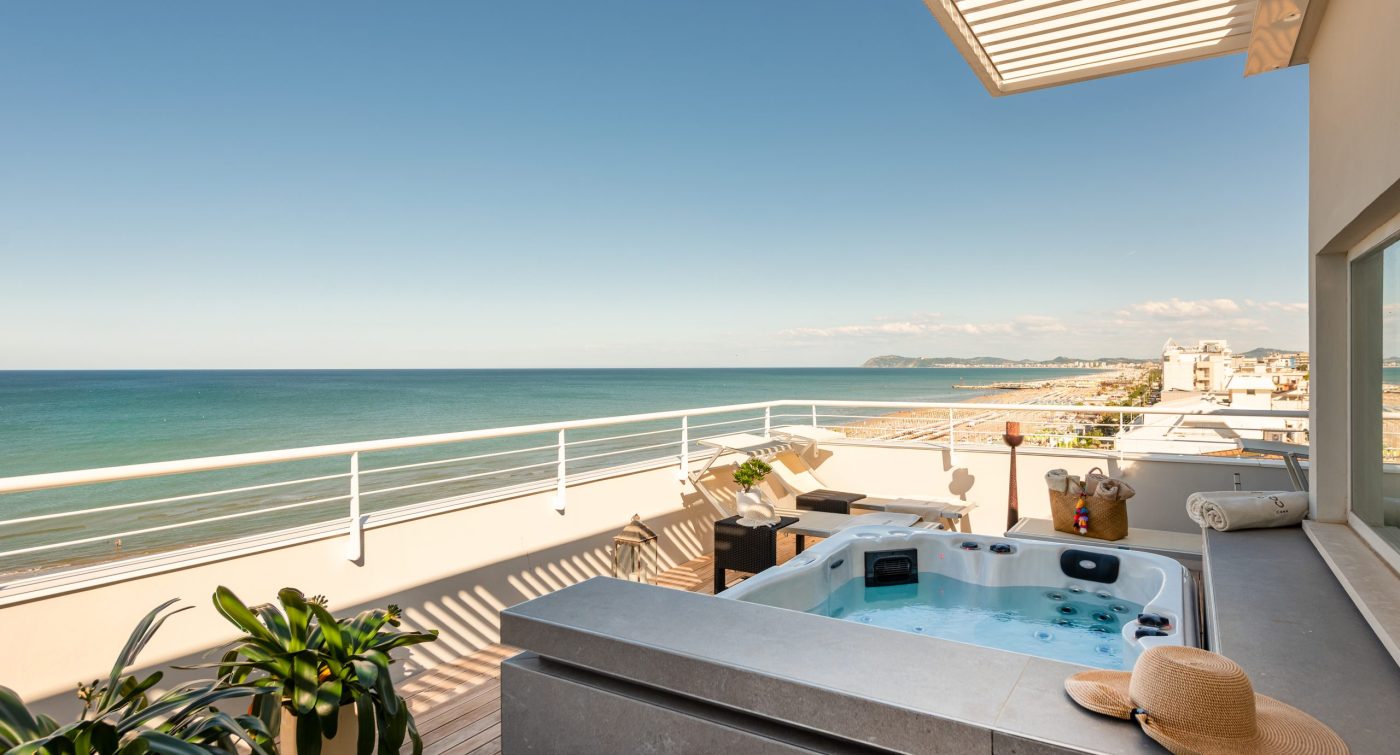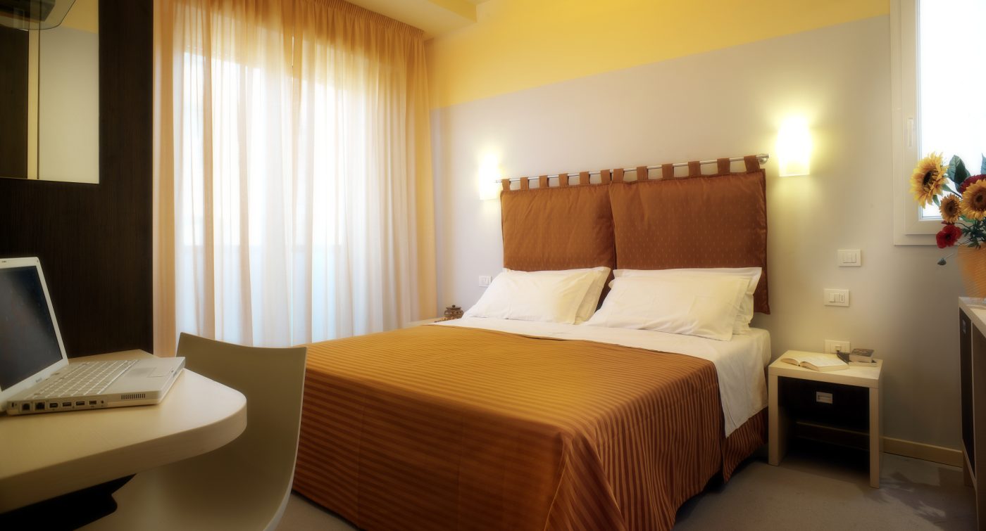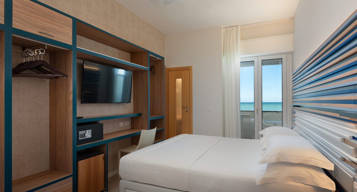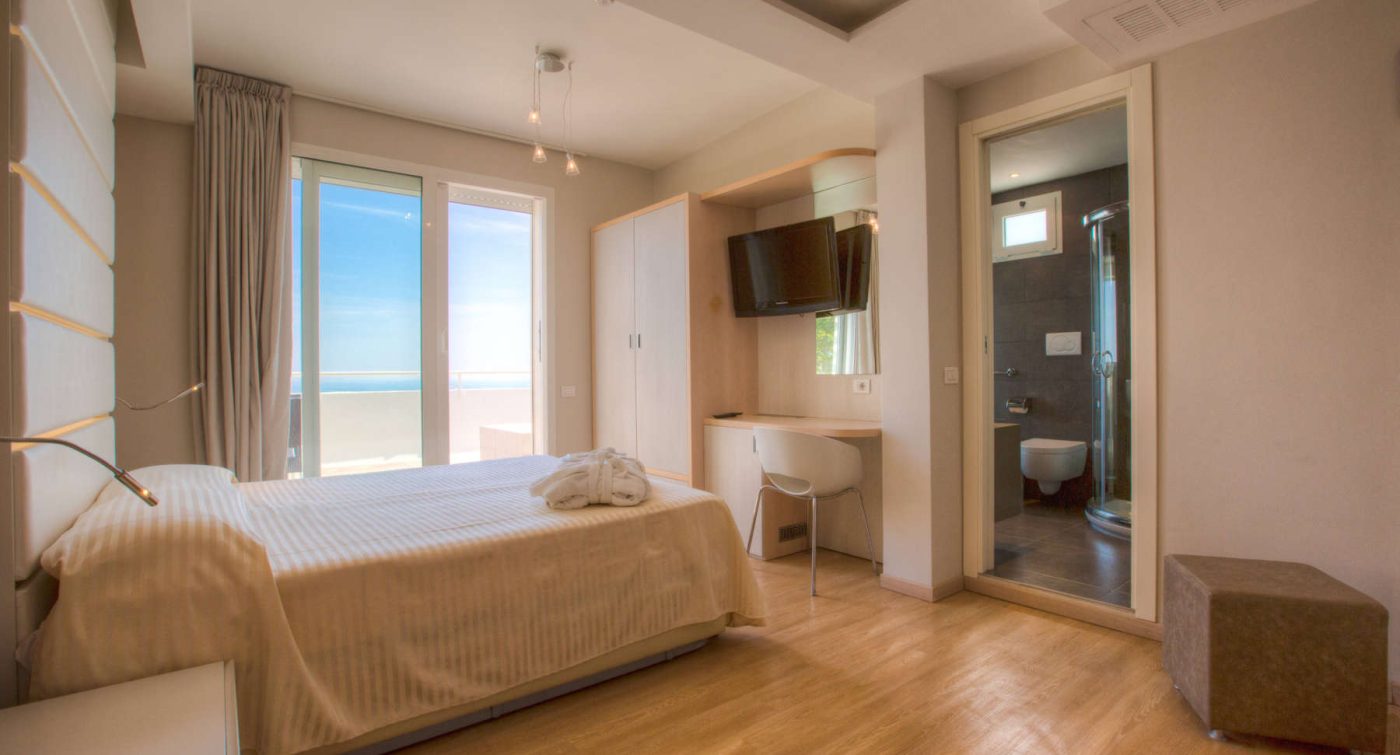 Camere Standard, dotate di ogni comfort per chi cerca la convenienza, camere Superior con balcone vista mare laterale, Deluxe balcone fronte mare, 2 Junior suite con due camere comunicanti, per arrivare alle Sky Room al 6° piano con terrazza solarium, bagno turco e Sky Room Deluxe con Jacuzzi privata sulla terrazza.