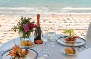 Sky Restaurant panoramico al 5° piano con vista mozzafiato, la ricca cucina unisce piatti della tradizione romagnola a specialità della cucina italiana, pesce, carne, ma anche piatti vegetariani e vegani.