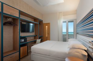 Camere Standard, dotate di ogni comfort per chi cerca la convenienza, camere Superior con balcone vista mare laterale, Deluxe balcone fronte mare, 2 Junior suite con due camere comunicanti, per arrivare alle Sky Room al 6° piano con terrazza solarium, bagno turco e Sky Room Deluxe con Jacuzzi privata sulla terrazza.