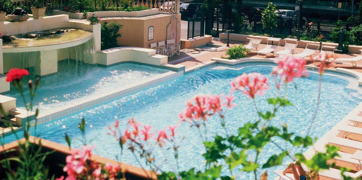 In centro a Riccione, sul porticciolo turistico, ad un passo dal mare. La più grande piscina di Riccione (23 X8 mt.) con una seconda vasca dotata di idromassaggio e cascata, area benessere con bagno turco, solarium, zona relax e cabina massaggi.