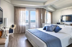 Camere Superior Vista Mare: Dotate di letto king size, balcone con vista laterale sul mare, TV LCD da 43″, aria condizionata e riscaldamento indipendenti, insonorizzazione, cassaforte elettronica, minibar e set bollitore con infusi.