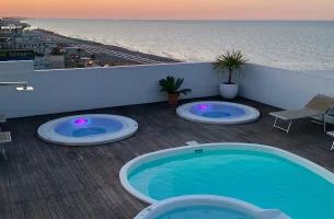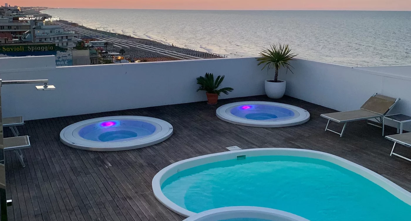 • Piscina panoramica al 7° piano: L’Area Wellness dell’hotel include una piscina con vista sul mare, 2 vasche idromassaggio e un solarium attrezzato. È il luogo ideale per rilassarsi e godere di panorami mozzafiato.