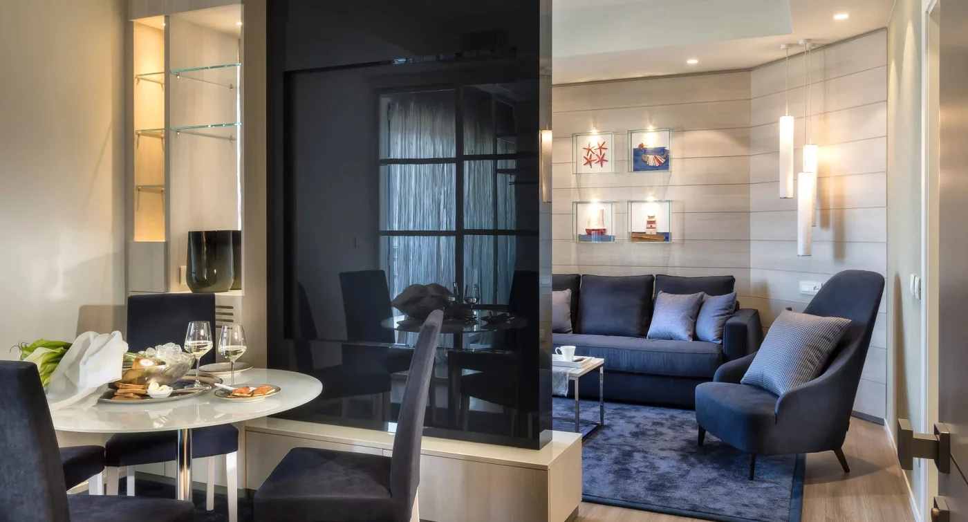 Suite: Situata al 6° piano, offre una vista panoramica sul mare con una grande terrazza. Composta da soggiorno, cabina guardaroba, salotto, camera da letto e un ampio bagno. Può ospitare fino a 4 persone grazie al salotto trasformabile in una camera matrimoniale.